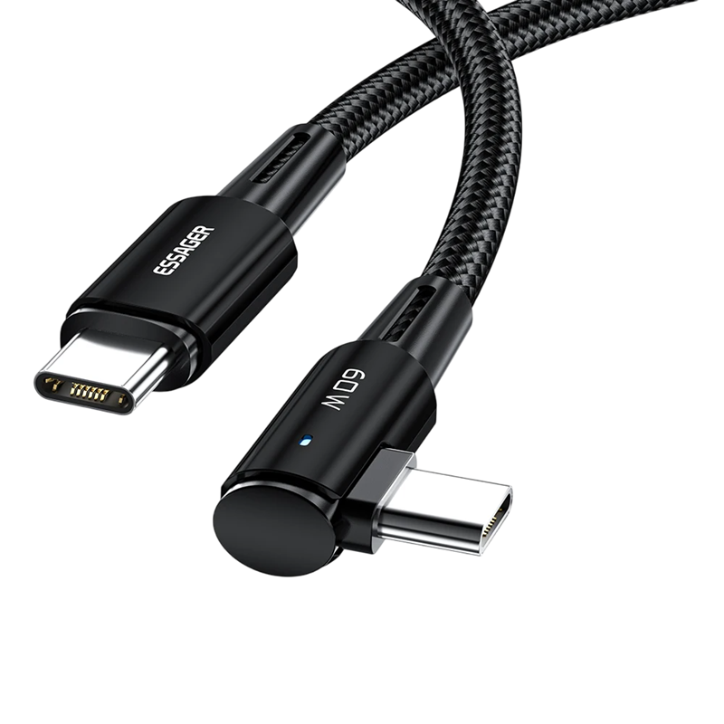 Cavo USB C lungo 2 m con angolo di 90°, potenza di 60W, luce LED, supporto per ricarica rapida QC4.0/PD e trasferimento dati a 480 Mb/s. Descrizione completa
