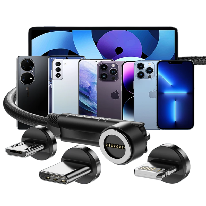 • Contenuto della confezione: 1× cavo USB A magnetico rotante (1 m) + 3× spine magnetiche (iOS Lightning, USB C, Micro USB)
