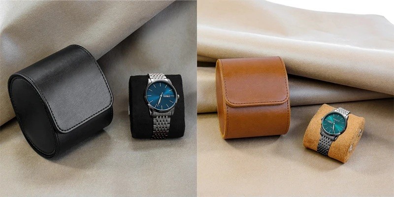 Astuccio compatto per un orologio adatto per viaggiare e per la conservazione a casa. Astuccio rotolante con cuscinetto interno che protegge l'orologio durante il trasporto. Descrizione completa