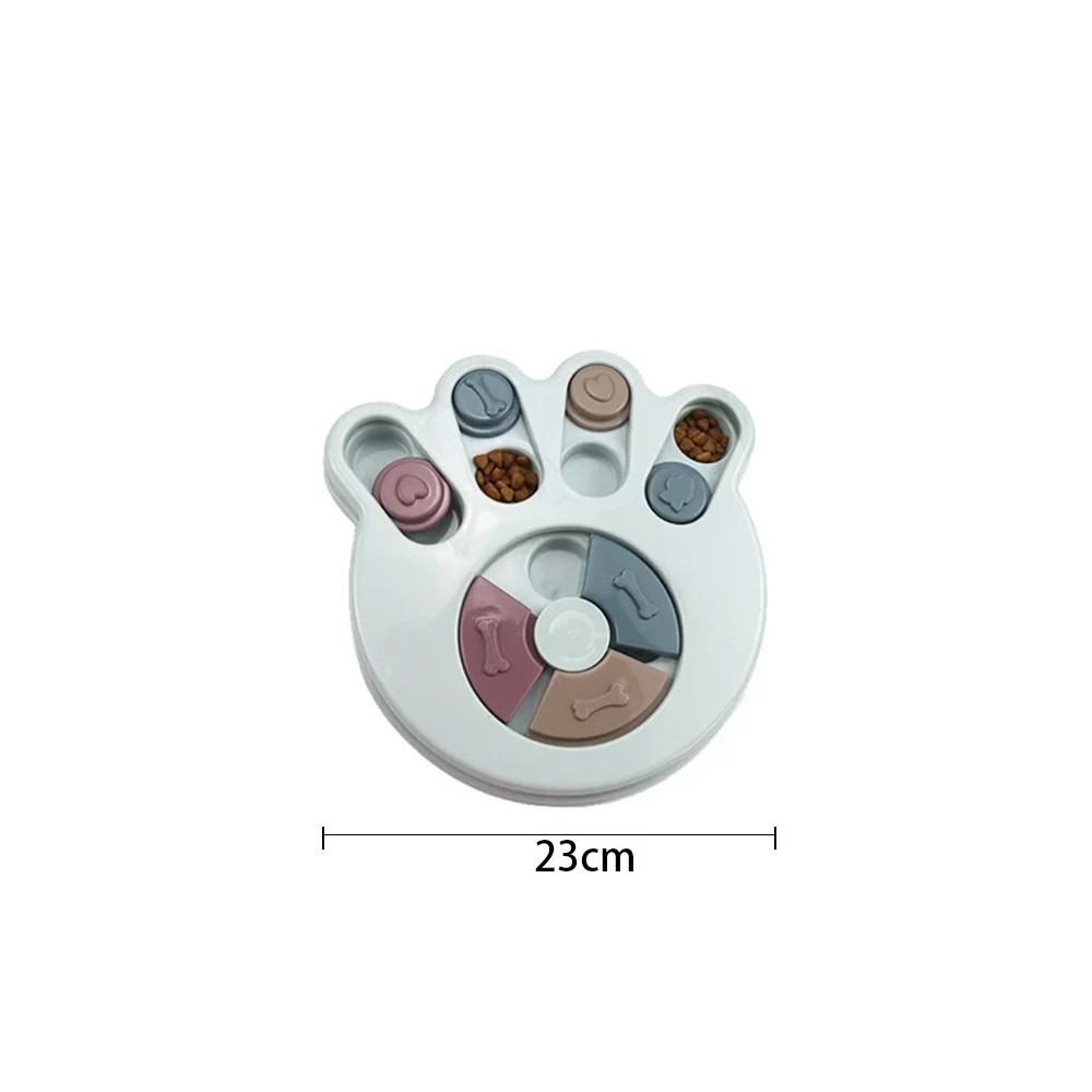 Questa ciotola interattiva a forma di zampa è progettata per rallentare l'alimentazione e sviluppare l'intelligenza del tuo animale domestico. Aprendo e spostando i coperchi, il cane o il gatto possono accedere agli snack o ai croccantini nascosti. Questo metodo di alimentazione promuove la stimolazione mentale, migliora la concentrazione e previene il mangiare vorace. La ciotola ha un diametro di 23 cm, ideale per cani e gatti di taglia piccola e media.