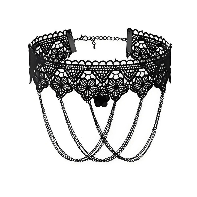 Il pendente centrale posizionato al centro del choker crea un dettaglio distintivo che attira l'attenzione. La combinazione di pizzo, catene e pendente appare decorativa e conferisce alla collana un carattere unico. Il choker da donna è adatto come accessorio per diversi stili di abbigliamento, specialmente dove si desidera mettere in risalto la zona del collo.