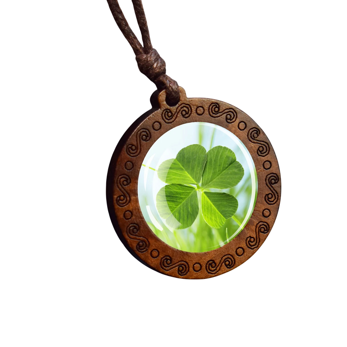 Questa collana con ciondolo quadrifoglio colpisce per il suo aspetto naturale e il design semplice. Il ciondolo ha una forma rotonda ed è inserito in una cornice di legno con delicati decori decorativi. All'interno si trova il motivo del quadrifoglio verde, tradizionalmente associato al simbolo della fortuna.