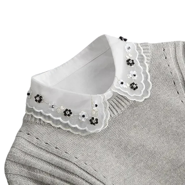 Colletto finto per donne bianco con fiori 3D neri è il complemento perfetto per ogni donna che desidera migliorare il proprio outfit con un elemento semplice e stiloso. Questo colletto rimovibile può essere facilmente aggiunto a un maglione, camicetta o abito, creando in un attimo un aspetto lussuoso.