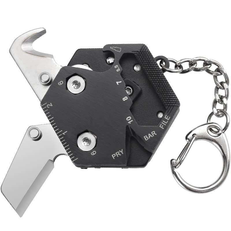 Questo piccolo coltello ha molto da offrire. Offre funzioni come un taglierino per cinture di sicurezza, apribottiglie, lime e altro. Grazie al portachiavi puoi tenerlo sempre con te.