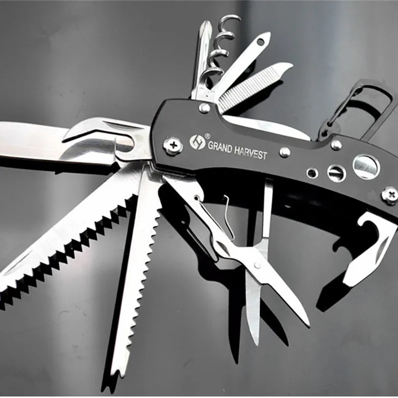 - 11 funzioni in 1 strumento – coltello, cavatappi, forbici, limetta, cacciavite a croce, apribottiglie e apriscatole, gancio, 2 seghetti