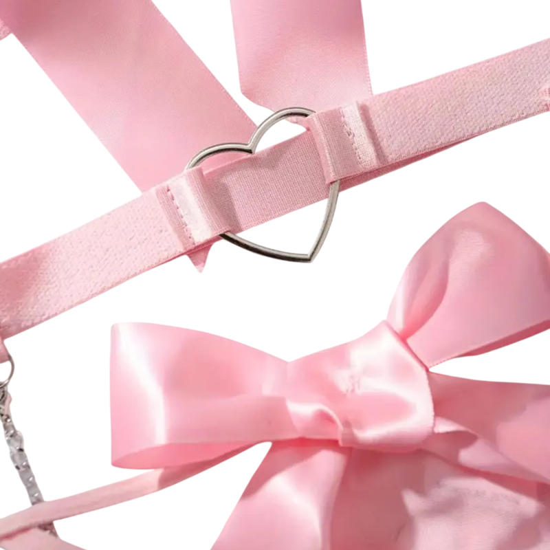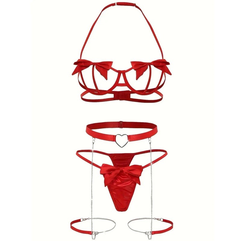 Il completo intimo da donna è composto da un reggiseno e slip arricchiti da elementi decorativi distintivi. Il dettaglio predominante sono le fasce e i fiocchi decorativi, che costituiscono l'elemento visivo principale dell'intero set. La costruzione delle singole parti è progettata per armonizzarsi e creare un aspetto uniforme. Il materiale in poliestere e spandex contribuisce all'elasticità e all'adattamento durante l'uso. Il completo è adatto per un utilizzo quotidiano e come complemento della biancheria intima.
