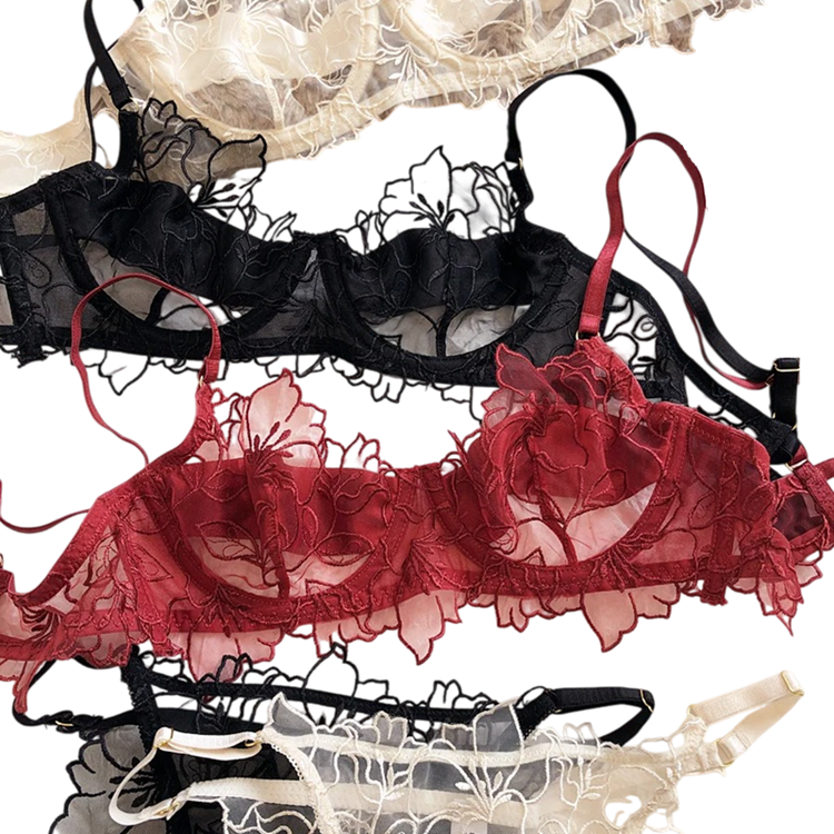 Pizzo trasparente con motivo accentuato abbinato a materiale elastico. Il set di reggiseno e slip si adatta alla figura ed è adatto per l'uso quotidiano. Descrizione completa