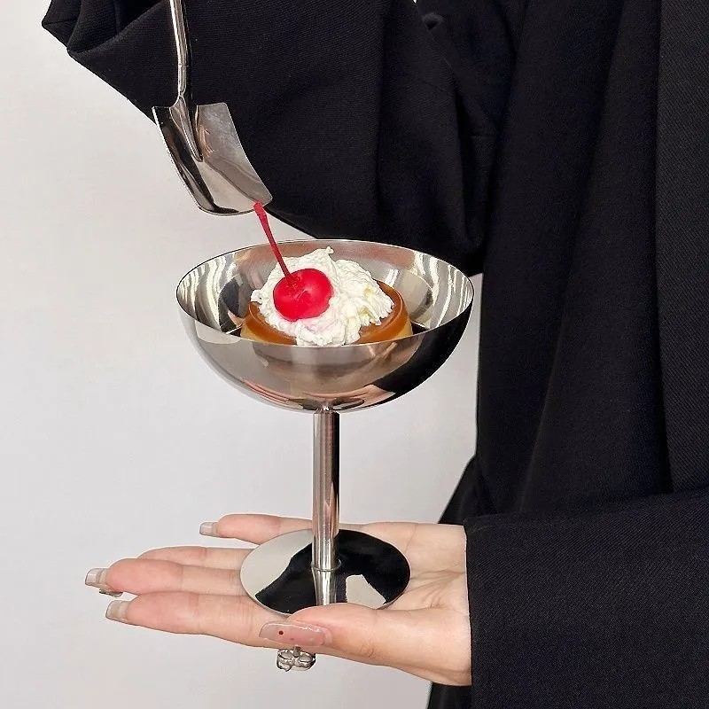 Elegante ciotola da dessert in acciaio inox su piede, adatta per gelato e dolci. Dimensioni 9,5 × 11 × 6,5 cm per un servizio pratico. Descrizione completa
