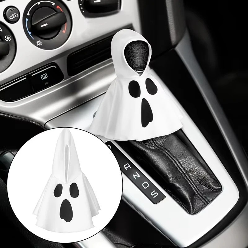 Copridisco di cambio stiloso in bianco con motivo di fantasma, realizzato in cotone e poliestere, protegge la testa del cambio dall'usura e conferisce all'interno dell'auto un aspetto originale. Descrizione completa