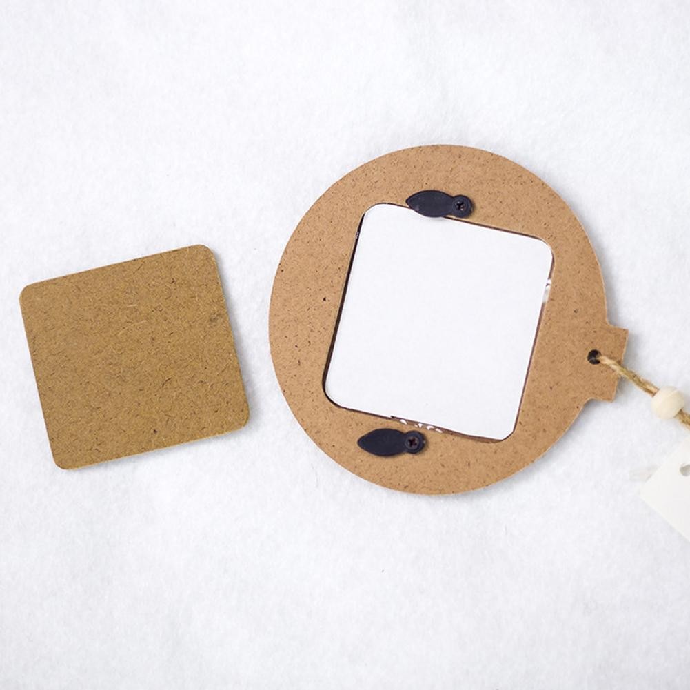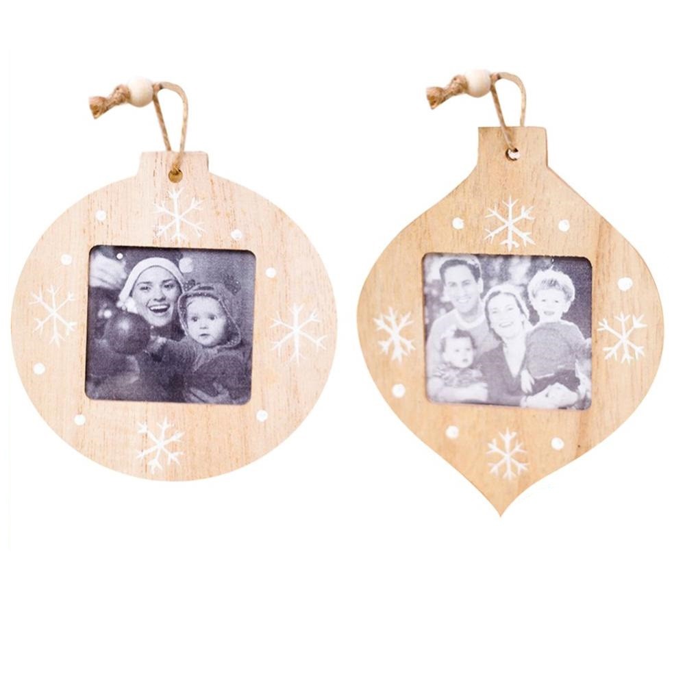 Originale cornice fotografica in legno a forma di palla di Natale da appendere.