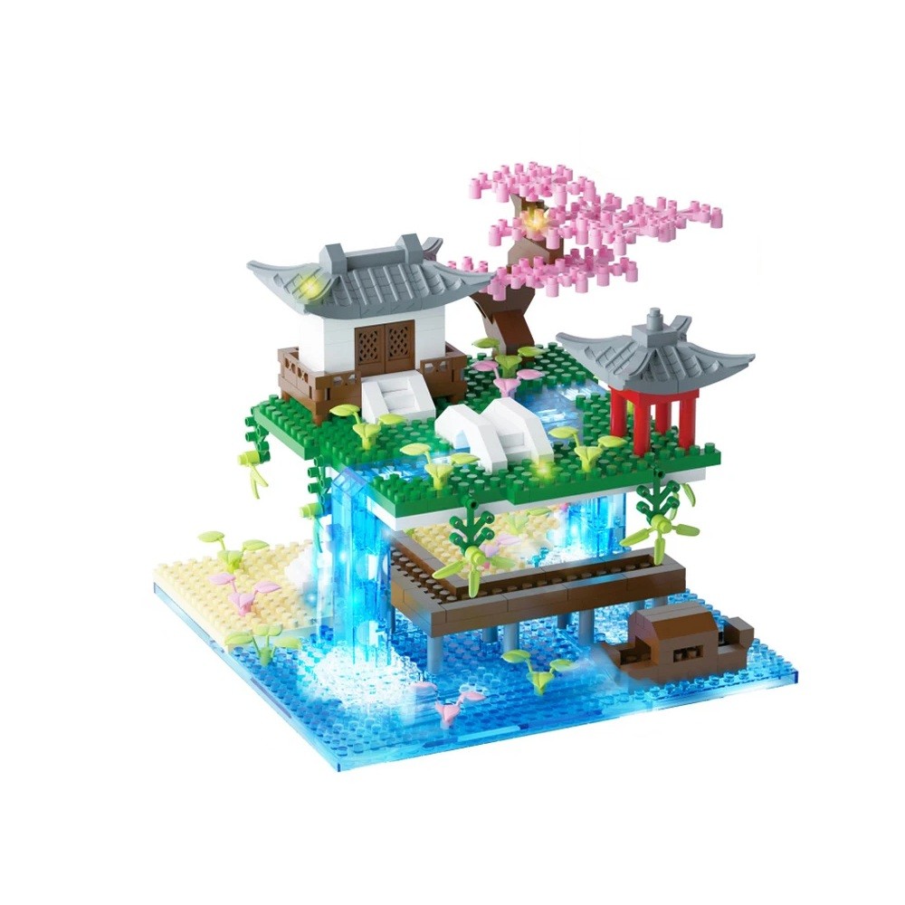 Costruzione giardino giapponese 145 x 135 x 110 mm Mini blocchi Cascata Pagoda Sakura Casa giapponese tradizionale Ponte Modello decorativo per bambini e adulti