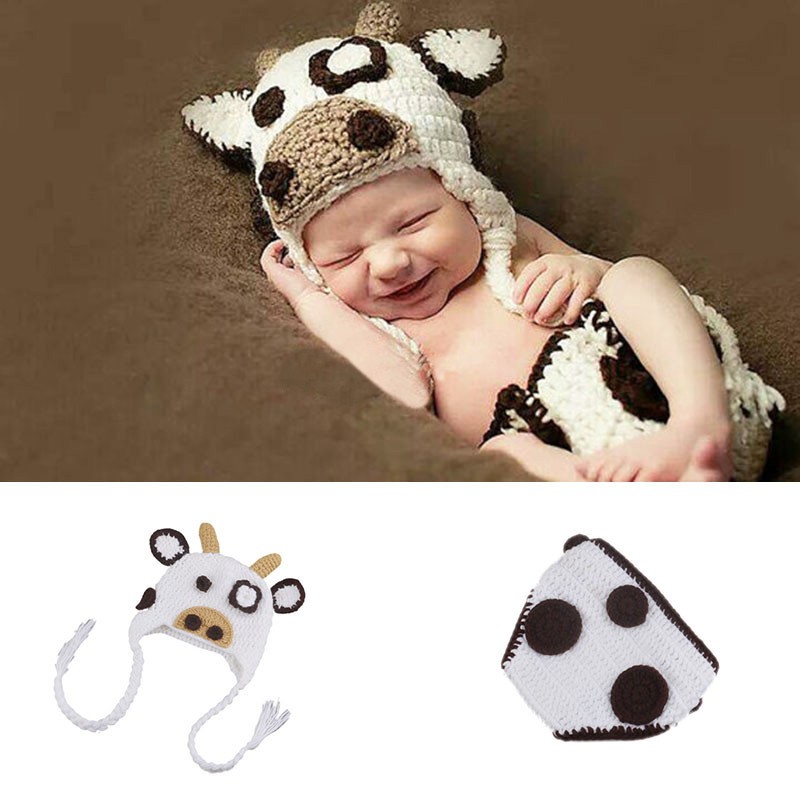 Divertente costume lavorato a maglia di mucca per servizi fotografici di neonati.