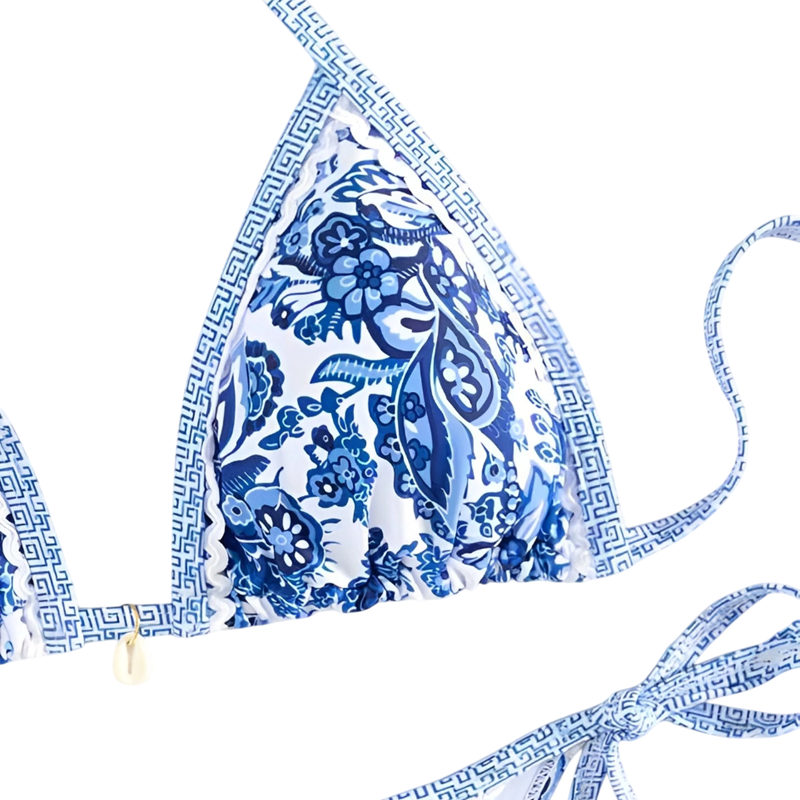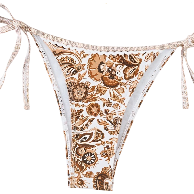 Costumi da bagno romantici con stampa floreale, top triangolare e slip con lacci ideali per la spiaggia, la piscina e le foto estive. Descrizione completa