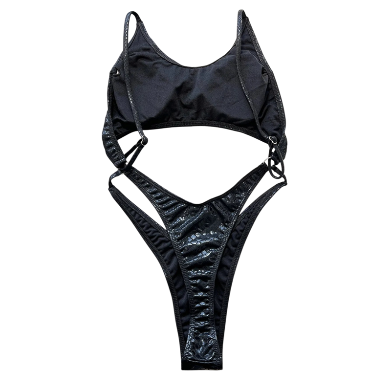 Eleganti e audaci, i costumi da bagno interi da donna sono la scelta ideale per le donne che vogliono brillare davvero in spiaggia. Il taglio moderno con dettagli evidenti appare sensuale e sicuro di sé. Il colore nero, combinato con l'imitazione della pelle di serpente, conferisce al modello un aspetto lussuoso e sofisticato. Questi costumi sono perfetti per una vacanza al mare, a bordo piscina o per feste estive alla moda.