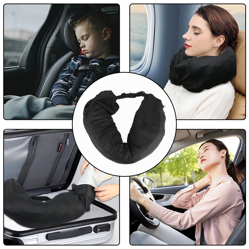 Cuscino da viaggio gonfiabile a forma di U con fibbia e cinghia regolabile per un facile trasporto sugli abiti, ideale per viaggiare e riposare. Descrizione completa