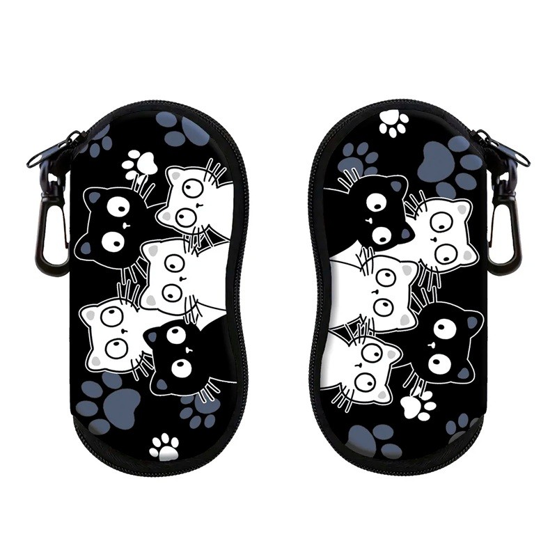 Custodia per occhiali nera 17,9 x 8,5 cm con motivo di gatti disegnati Zip con moschettone per appendere Protezione per occhiali in viaggio