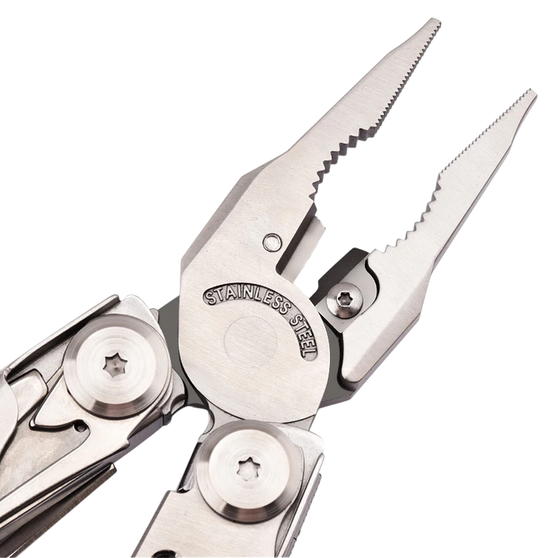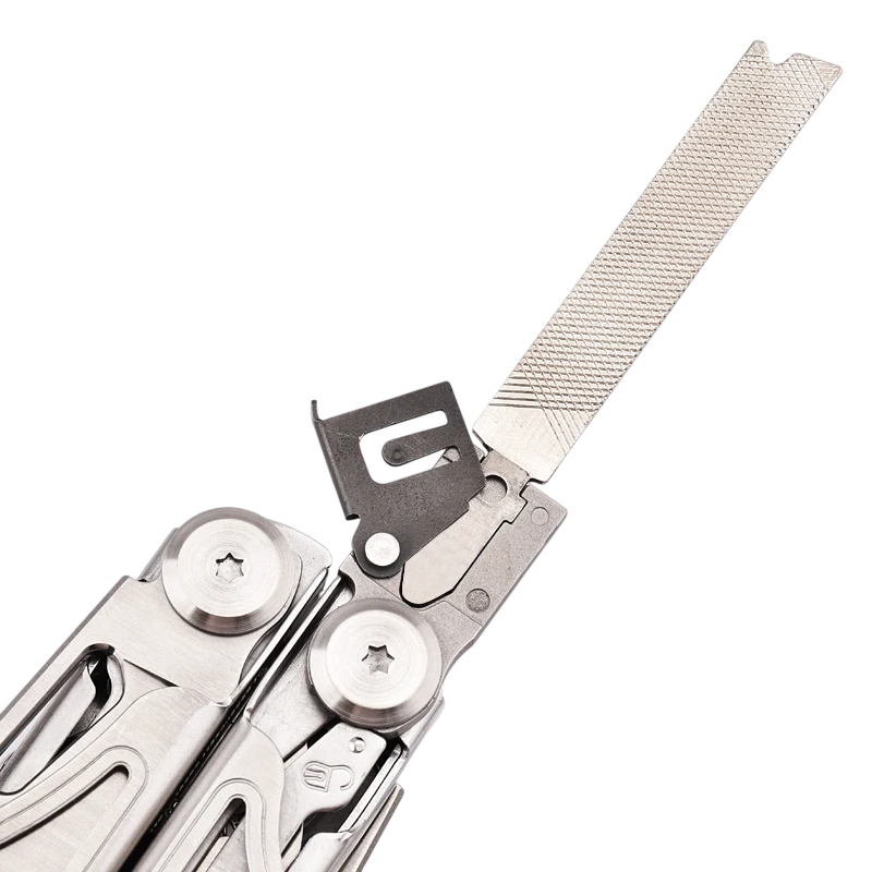 Lo strumento include pinze piatte, pinze per dadi, tronchesi per filo morbido e duro, pinze spelafili e un dispositivo di sicurezza. Inoltre, lo strumento contiene diversi tipi di coltelli, una sega, forbici, una lima, un apribottiglie e un righello. Grazie ai bit intercambiabili, diventa anche un pratico cacciavite con ampia compatibilità. Il design ergonomico pieghevole consente un facile trasporto in tasca o nella custodia fornita. Questo modello è apprezzato come strumento EDC per la preparazione quotidiana e come attrezzatura importante per la sopravvivenza nella natura.