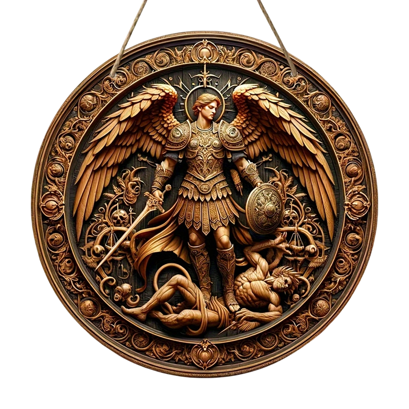 Disco da parete in legno con angelo alato che tiene una spada e uno scudo simboleggia protezione e forza e funge da decorazione spirituale distintiva. Descrizione completa