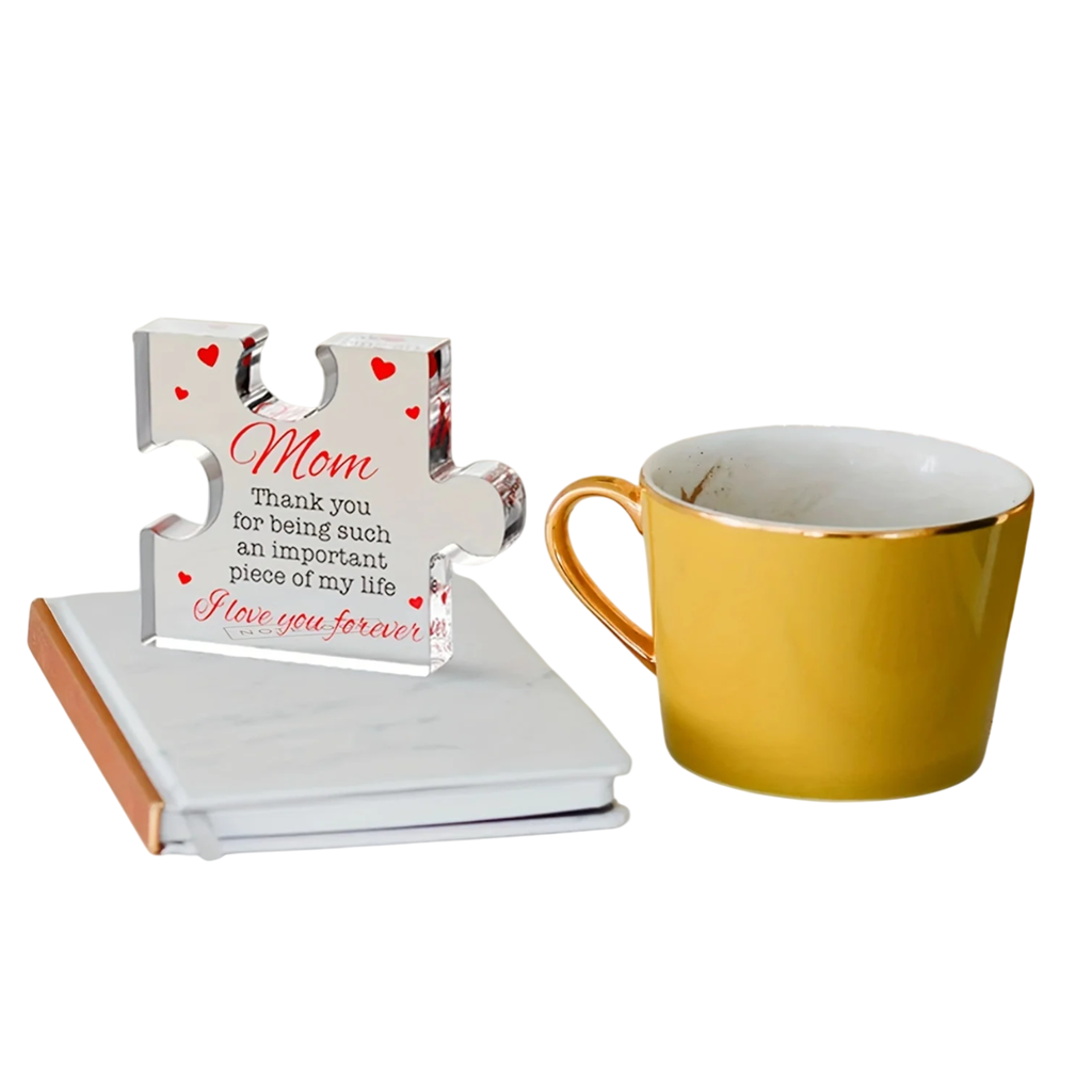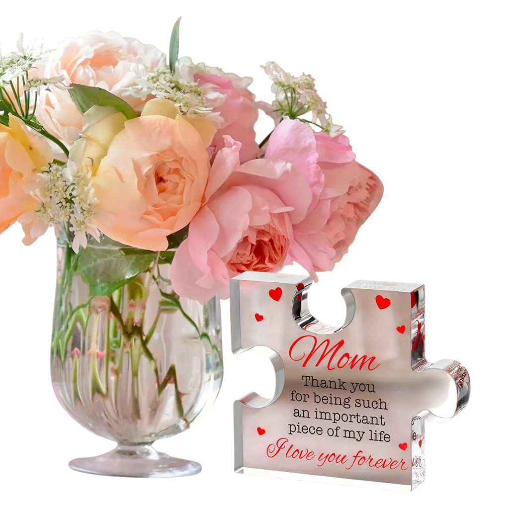 Questo ricordo decorativo rappresenta un elegante regalo di ringraziamento per mamma, che porterà gioia in ogni occasione. Il design stiloso e la lavorazione precisa creano un bellissimo simbolo d'amore e legame familiare. La decorazione è realizzata in acrilico inciso di alta trasparenza, il che le conferisce un'impressione di lusso e modernità. Grazie alle compatte dimensioni di 8,5 x 7 x 1 cm, si adatta perfettamente su una mensola, una scrivania o un comodino. Il design originale rappresenta un design unico a forma di puzzle, che simboleggia il legame speciale tra i bambini e la mamma.