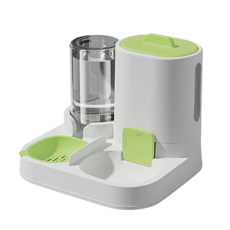 Questo distributore automatico di acqua e mangiatoia per gatti è la soluzione ideale per i proprietari che desiderano garantire al proprio animale domestico un apporto costante di acqua fresca e cibo senza la necessità di rifornimenti frequenti. Grazie al sistema gravitazionale, acqua e croccantini si riforniscono automaticamente nelle ciotole secondo necessità, garantendo comodità per voi e il vostro animale. Il design moderno e le dimensioni compatte 25 x 23 x 21 cm consentono un facile posizionamento in qualsiasi abitazione. Il distributore è dotato di cartuccia filtrante, che rimuove peli e impurità dall'acqua, contribuendo alla salute del vostro animale.