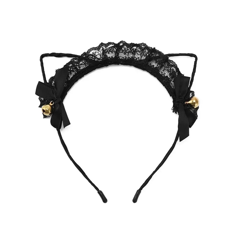 Fascia per capelli in pizzo con orecchie da gatto e campanellini Elegante accessorio per cosplay con fiocchetti Decorazione per carnevale e feste