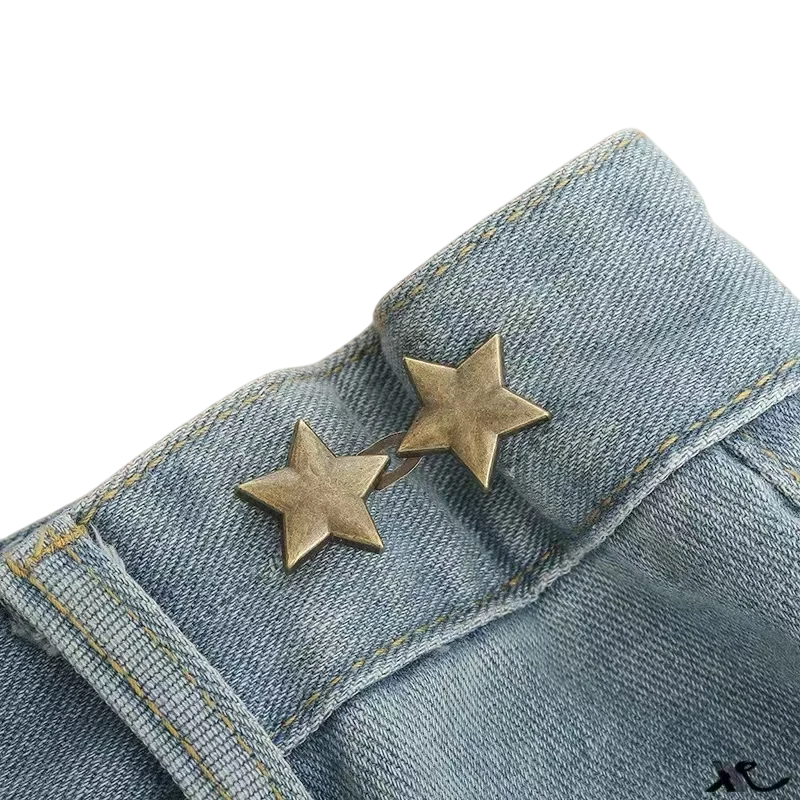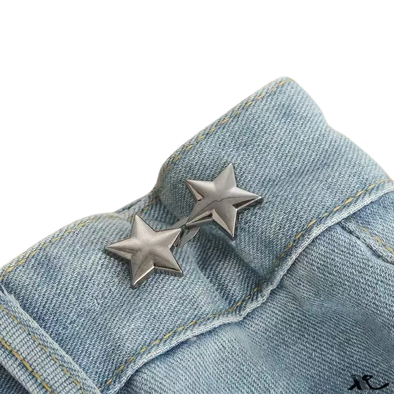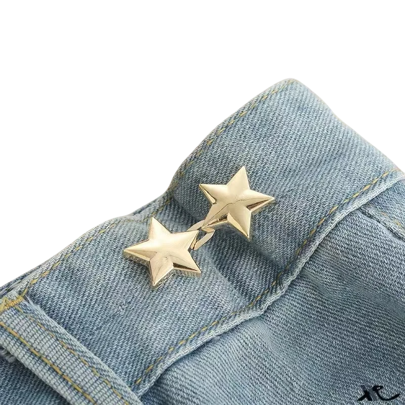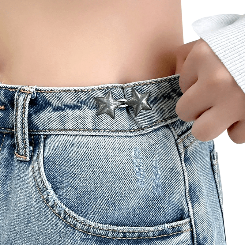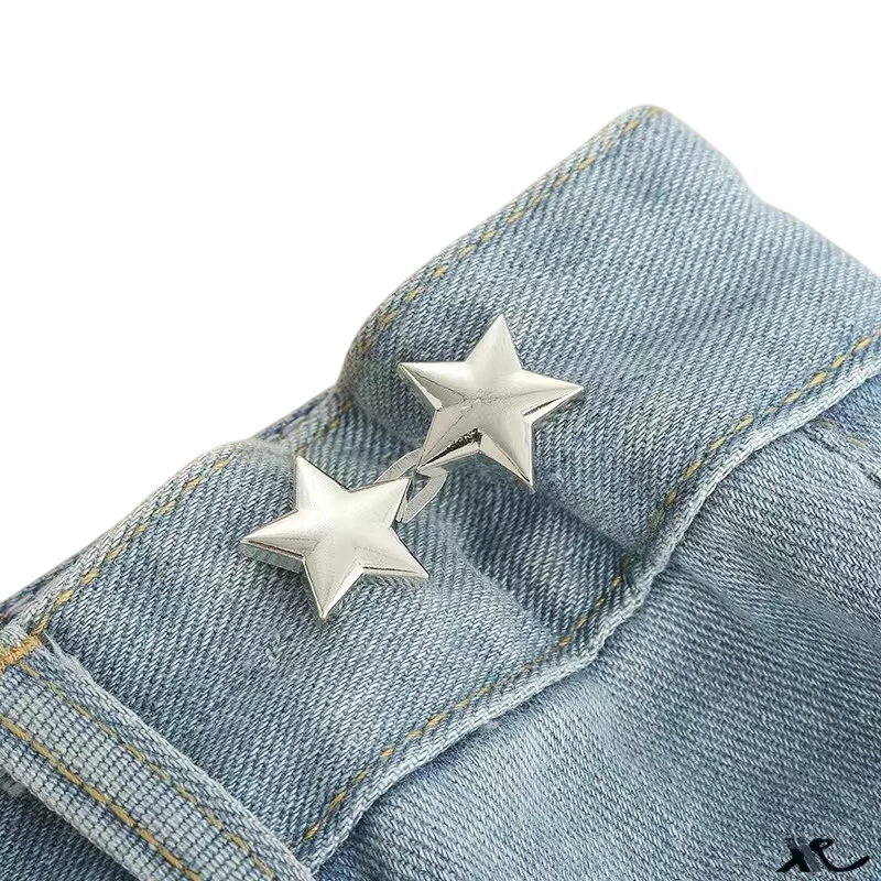 Elegante fibbia metallica con motivo di due stelle per un rapido e facile restringimento della vita senza cucire. Adatta per jeans, gonne e pantaloni. Descrizione completa