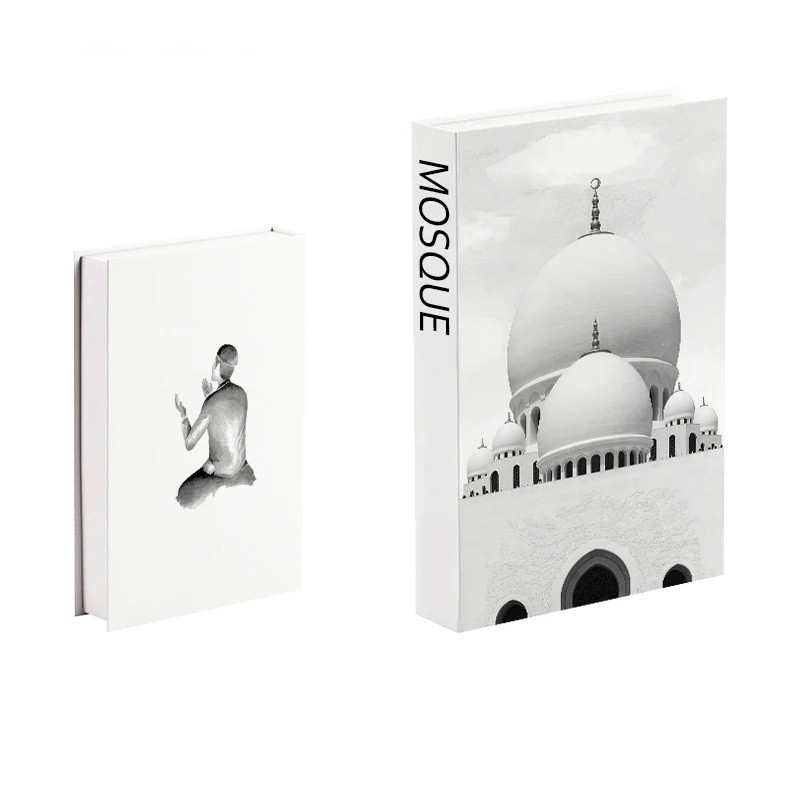 Questo elegante finta libro colpisce a prima vista con il suo design in bianco e nero caratterizzato da un'imponente moschea sul fronte. La cupola dominante e i dettagli architettonici conferiscono un'eleganza e un carattere sofisticato alla decorazione. Sul dorso è presente la scritta MOSQUE, che consente alla finta libro di integrarsi perfettamente tra gli altri libri nella libreria. Il retro è decorato con un'illustrazione minimalista di una figura in preghiera, sottolineando l'atmosfera spirituale e serena dell'intero motivo. Il principale vantaggio è la realizzazione apribile con spazio di archiviazione nascosto.