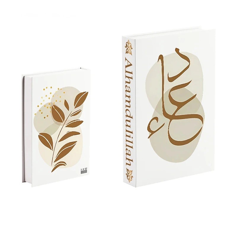 Questa finta libro decorativa colpisce a prima vista per il suo design elegante con la prominente scritta calligrafica araba Alhamdulillah sulla parte frontale. Le delicate tonalità beige abbinate alla scritta dorata e ai dettagli conferiscono un aspetto lussuoso e armonioso. Il dorso del libro è lavorato in modo stiloso per imitare fedelmente un vero volume, permettendo così di integrarsi perfettamente tra gli altri libri. Struttura non apribile garantisce una forma solida e una lunga durata.