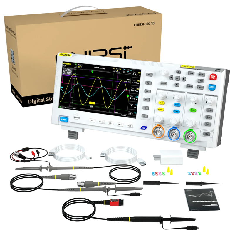 • Contenuto della confezione – oscilloscopio FNIRSI 1014D, sonda P4100, cavo di alimentazione EU, accessori di misurazione, manuale utente.