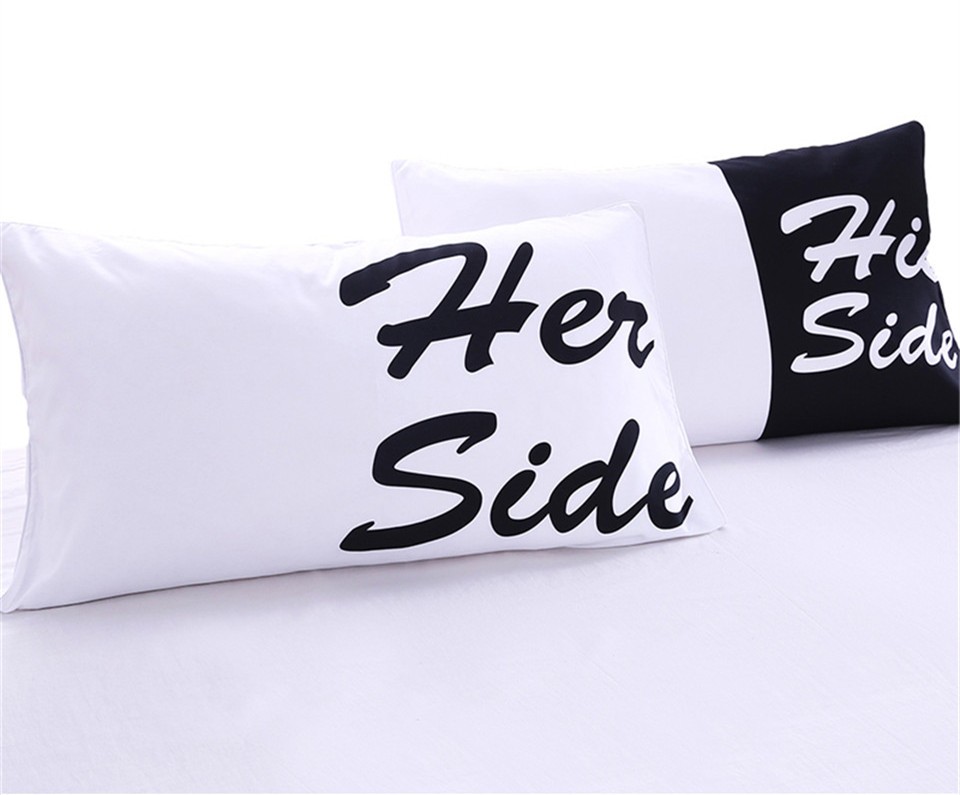 Divertente fodera per cuscino con la scritta „Lato di lei, Lato di lui = her side, his side. Grazie a questi cuscini non dovrete più litigare per il posto nel letto.