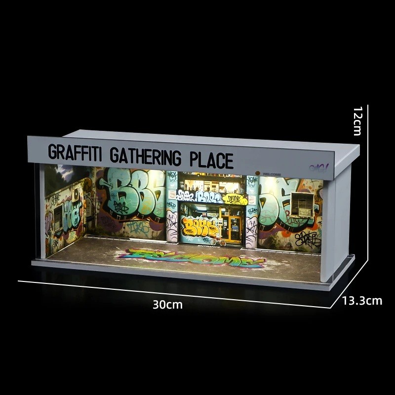 Garage grafitata illuminata 30 × 13,3 × 12 cm Diorama di un autoservizio per modelli di auto Scena espositiva vetrina da collezione USB illuminazione LED