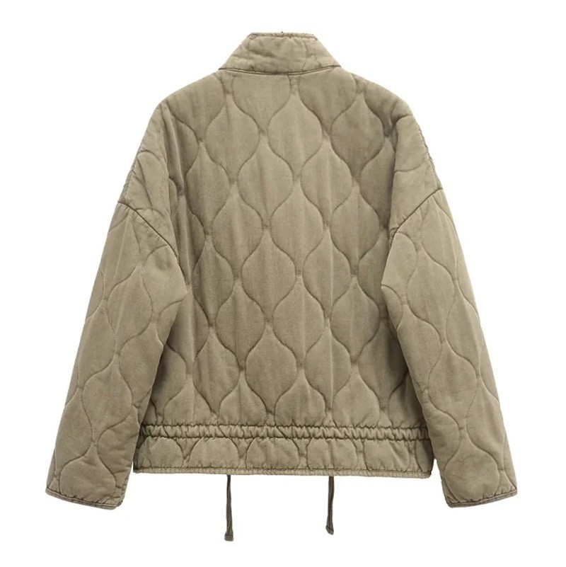 Leggera giacca trapuntata per donne con colletto, pratiche tasche e coulisse in vita. Ideale per la stagione di transizione e l'uso quotidiano. Descrizione completa