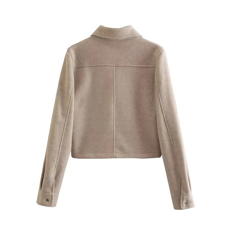 Giacca elegante da donna a vita con colletto e bottoni a pressione, ideale per la stagione di transizione. Si adatta perfettamente e si abbina sia a look casual che formali. Descrizione completa