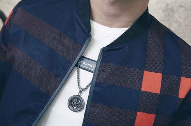 La giacca presenta righe che si intrecciano formando quadrati.