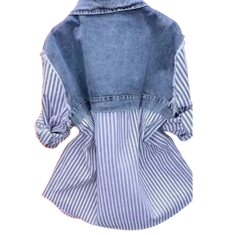 Giacca originale che combina un gilet di jeans e una camicia a righe. Design elegante a due strati per un uso quotidiano moderno e confortevole. Descrizione completa