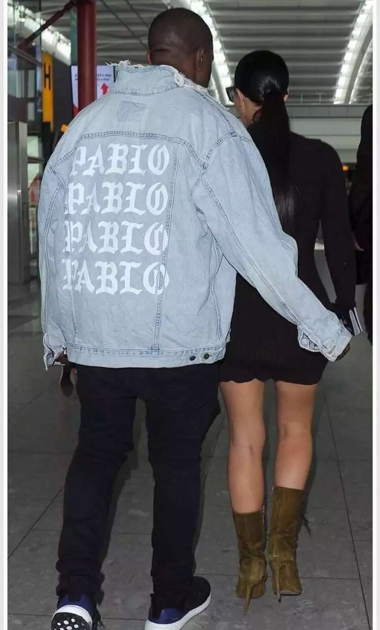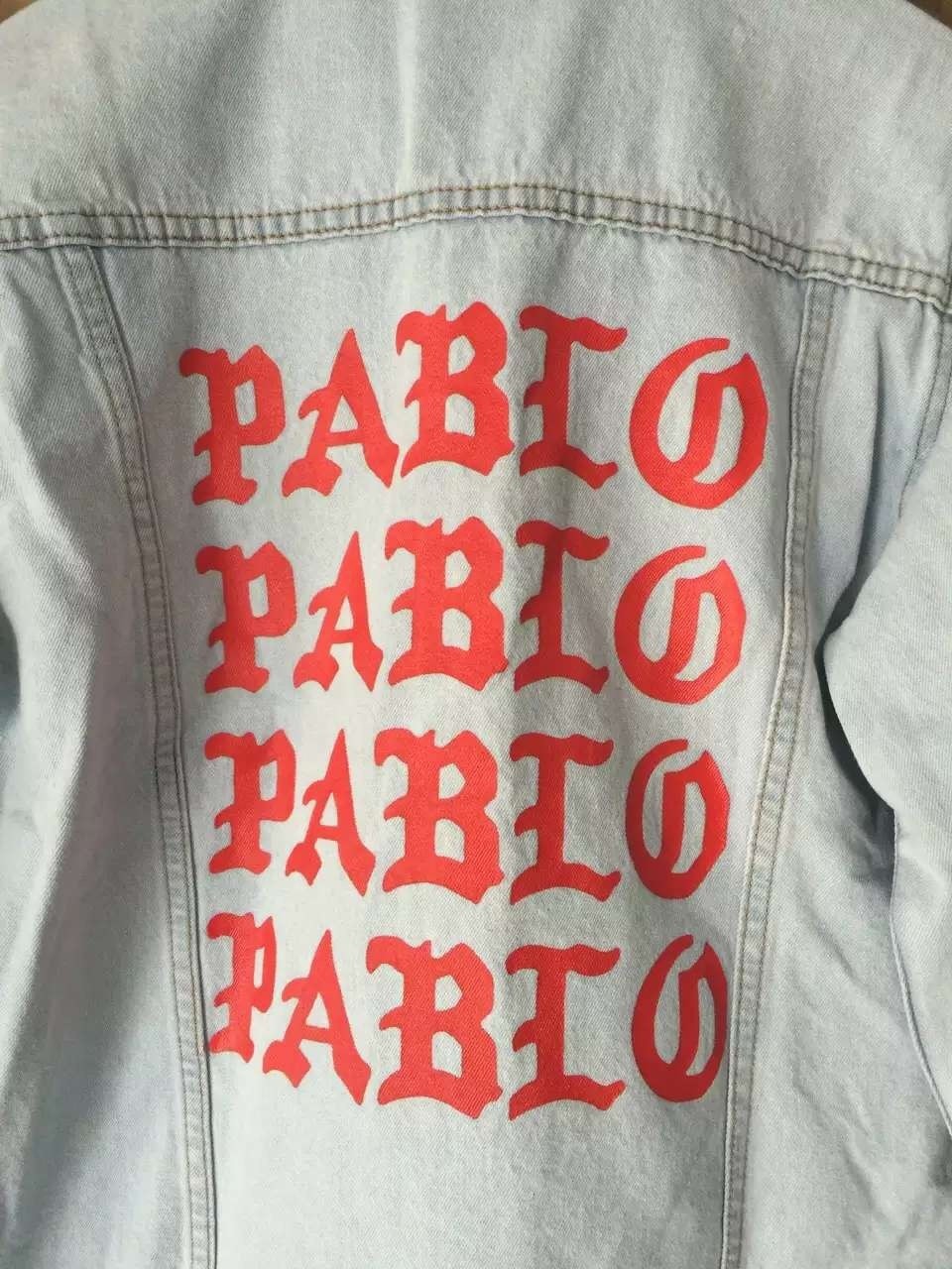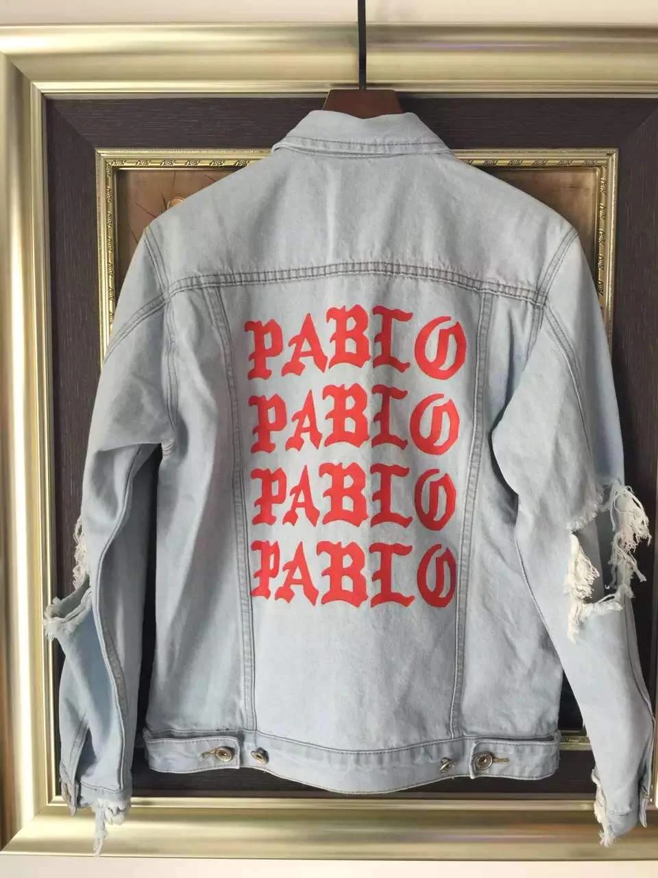 Essere stilosi con questa giacca di jeans con la scritta PABLO sul retro e con buchi sui gomiti.