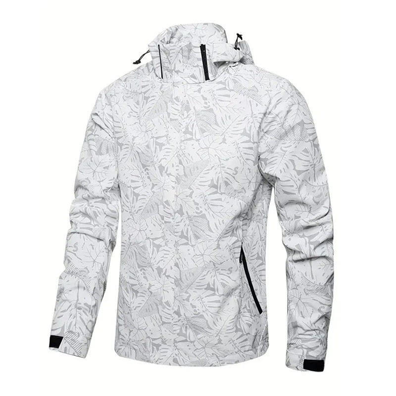 Giacca impermeabile da uomo con cappuccio e cerniera, motivo foglie, poliestere, con tasche, ideale per giorni freddi e piovosi, scelta comoda e funzionale. Descrizione completa