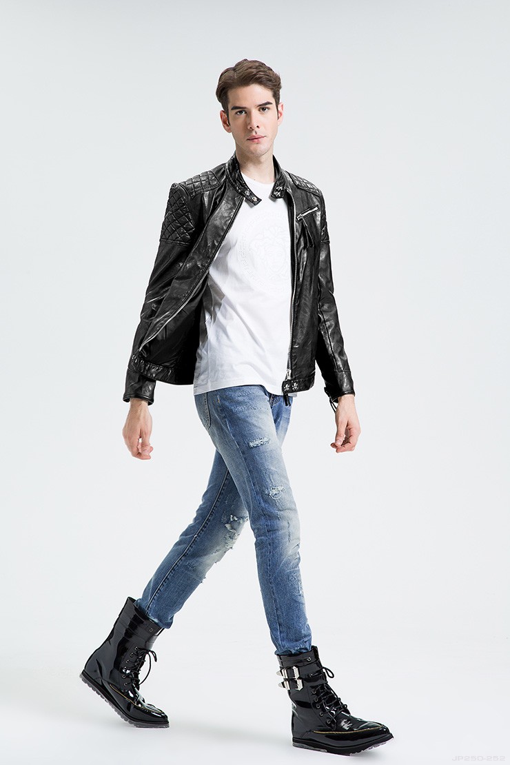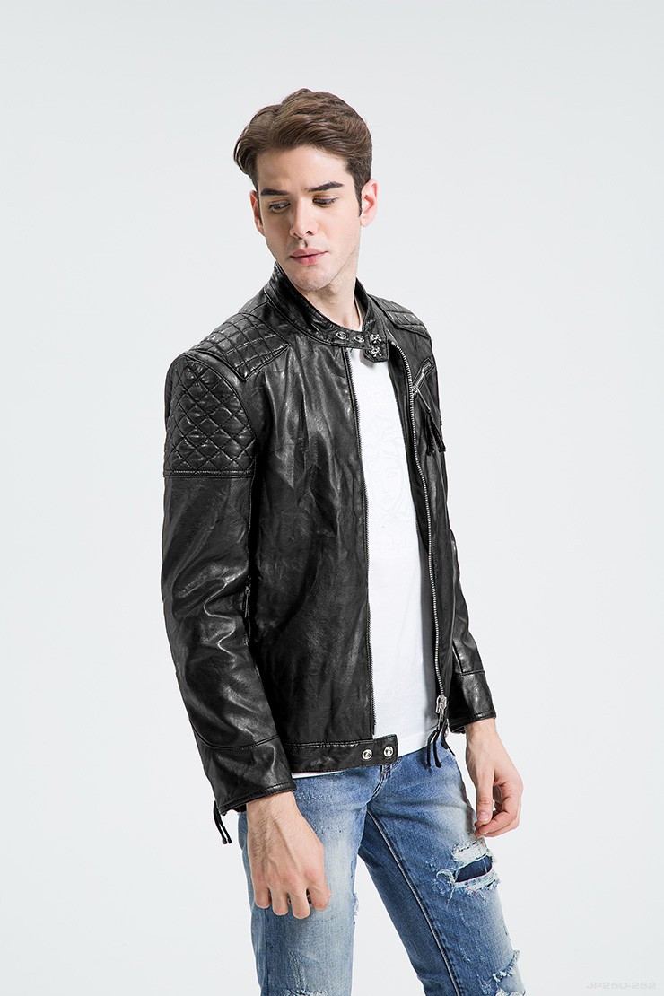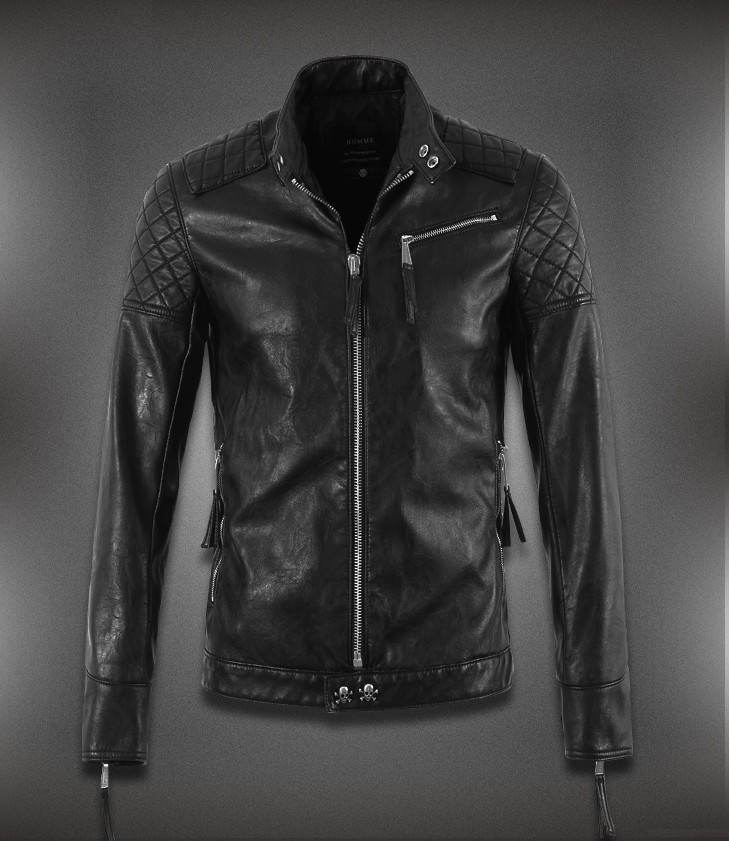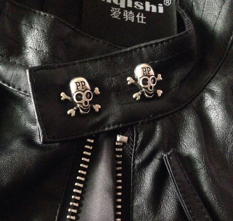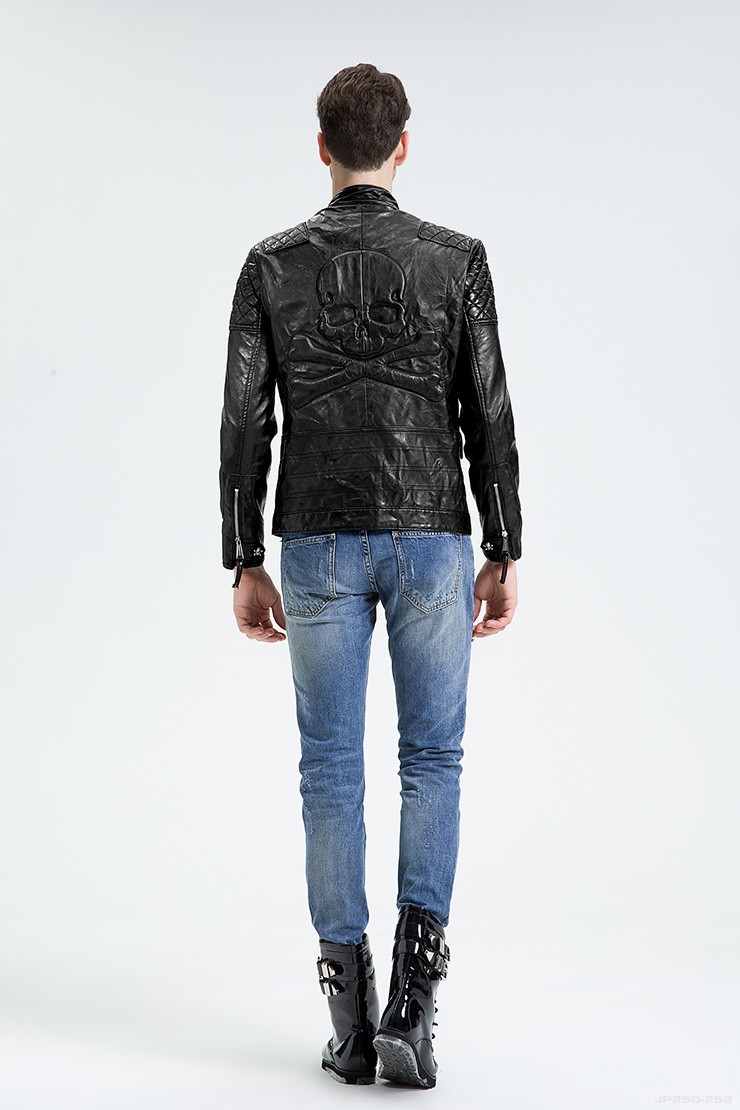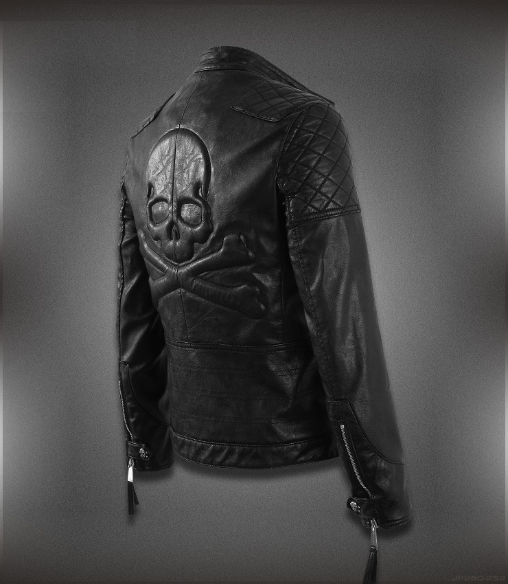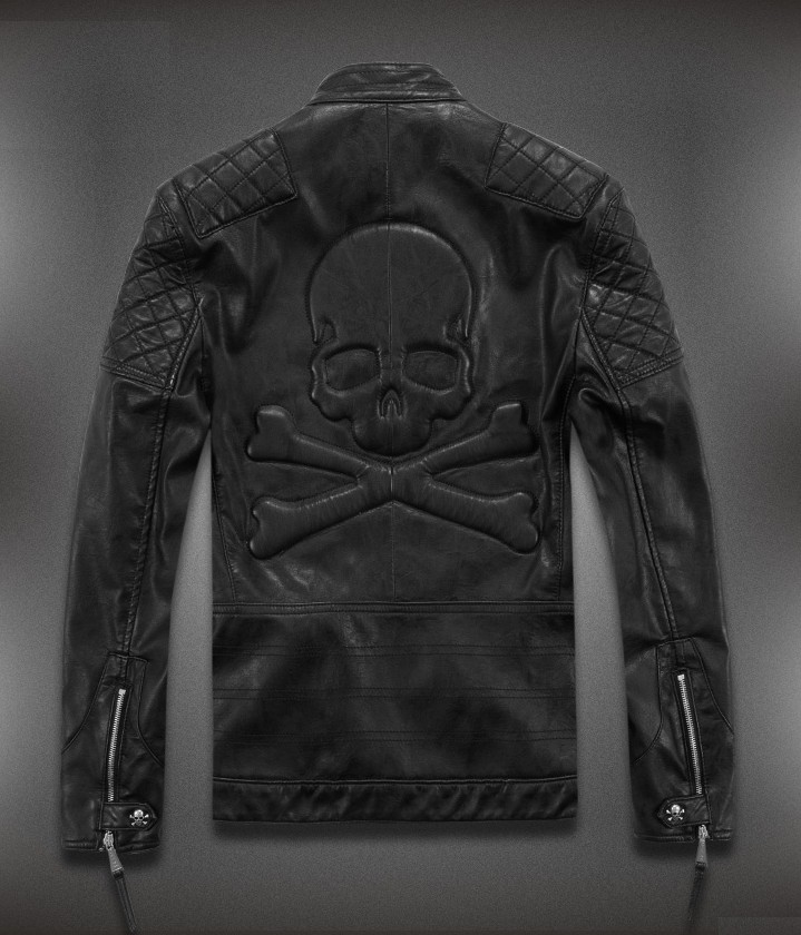 La giacca è in pelle e sul retro ha un enorme teschio.