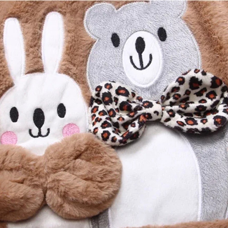 Giacca in peluche invernale per ragazze Chiusura con zip Tasche con orsetto Cappuccio con pelliccia e orecchie Immagine di un orso e un coniglio sulla schiena Cotone Poliestere