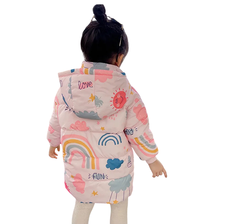 Giacca invernale da ragazza con cappuccio Chiusura con zip e bottoni Tasche Giacca calda in cotone e poliestere con motivi arcobaleno Giacchetta riscaldante per bambini