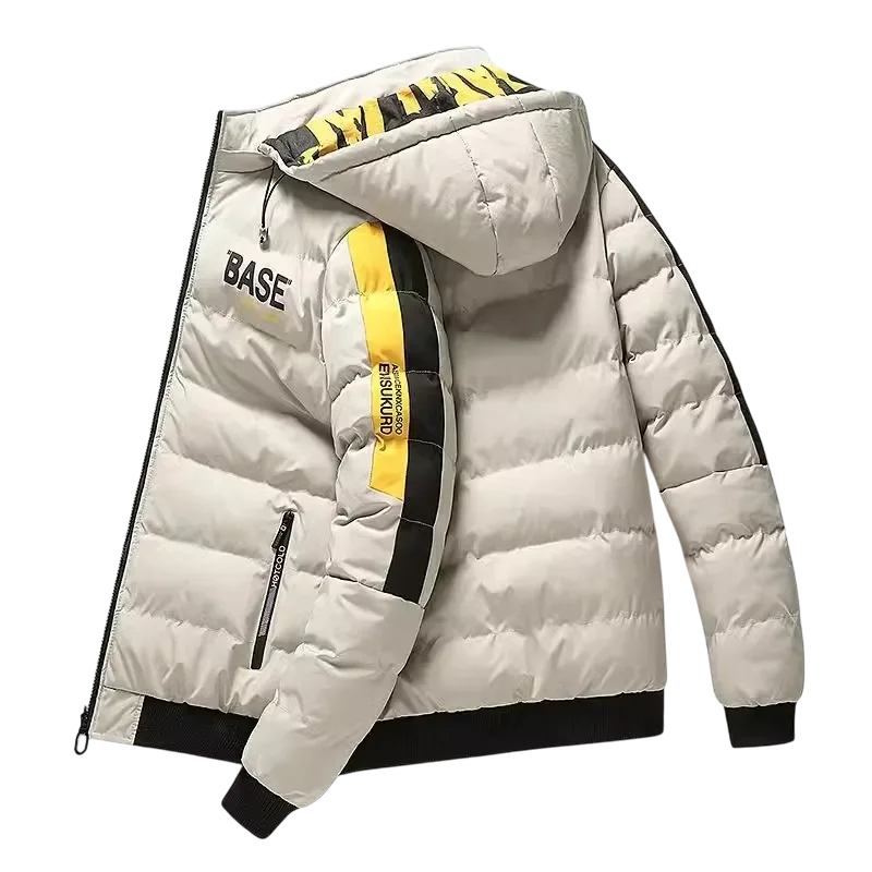 Giacca invernale da uomo alla moda con cappuccio, scritte sulle maniche, fodera e chiusura con zip. Ideale per la città e il tempo libero in climi freddi. Descrizione completa
