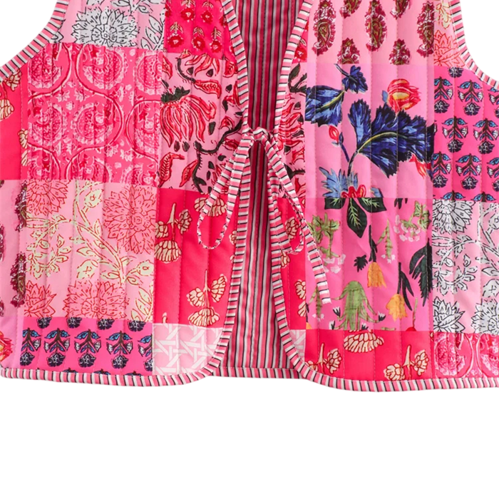 Gilet elegante da donna con motivi nei toni rosa e rossi, scollatura a V e chiusura con lacci. Un accessorio leggero, stiloso e confortevole. Descrizione completa