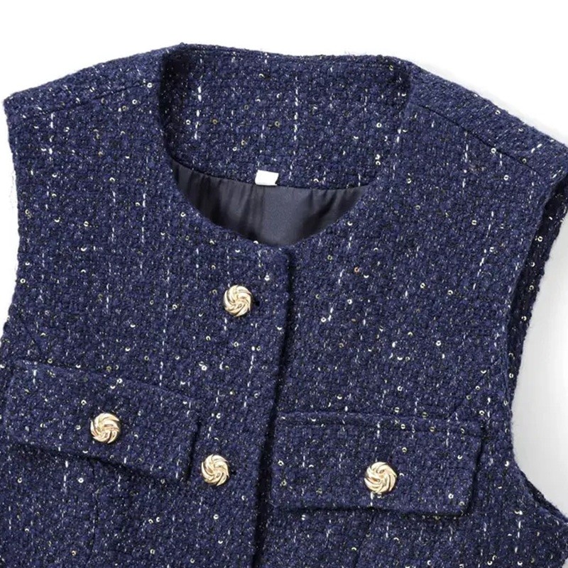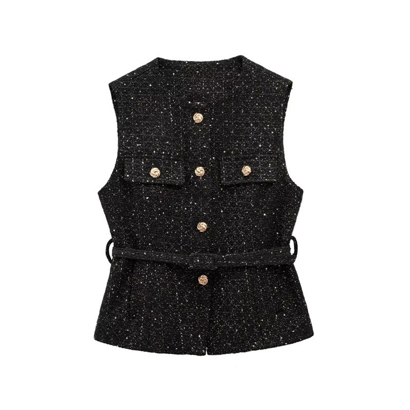 Gilet elegante da donna con cintura in vita, scollatura a O e taschino sul petto. Materiale in poliestere leggero e chiusura con bottoni per stile e comfort. Descrizione completa