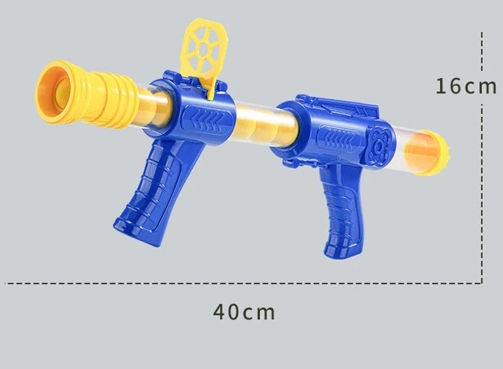Il set include una pistola a pompa di lunghezza 40 cm e altezza 16 cm. È progettata per essere leggera, ben impugnabile e facile da manovrare. Nella parte anteriore della canna si inserisce una pallina morbida in schiuma. La pistola funziona secondo il principio della pressione dell'aria. Prima è necessario spingere la pallina nell'imboccatura della canna, poi afferrare la parte posteriore della pistola e tirare verso indietro, riempiendo così la pistola d'aria. Successivamente, con un movimento brusco in avanti, la pallina viene sparata. Le palline in schiuma sono morbide e sicure, quindi il gioco è adatto anche per interni.