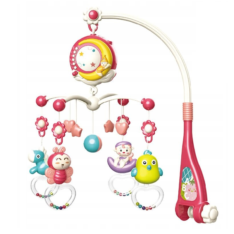 Funzioni e dotazioni: regolazione del volume, melodie, canzoni, suoni della natura, timer, giocattoli appesi rimovibili, proiettore, rotazione a 360°, telecomando