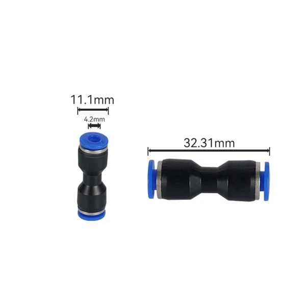 L'installazione del giunto è molto semplice e non richiede strumenti speciali. Le estremità del tubo si inseriscono semplicemente in entrambi i lati del giunto, dove sono saldamente trattenute dal meccanismo di bloccaggio interno. Con un'inserzione corretta, il collegamento è ermetico, resistente alla pressione e consente anche una facile disconnessione, se è necessario modificare l'assemblaggio o sostituire il tubo. Il giunto è progettato per carichi di lavoro elevati e resiste a pressioni fino a circa 1 MPa, rendendolo adatto anche per un'alimentazione rapida del filamento e per lunghe attività di stampa. Il corpo del giunto è realizzato in plastica resistente, che sopporta bene le sollecitazioni meccaniche e le temperature operative comuni delle stampanti 3D.