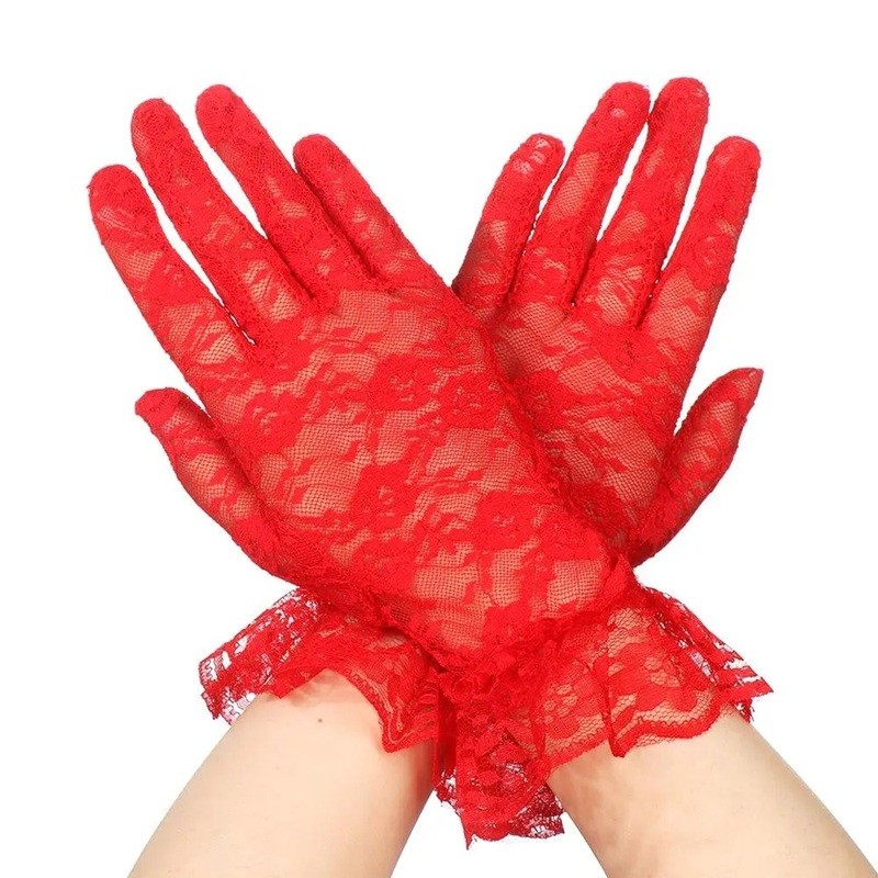 Guanti corti in pizzo con arricciatura e taglio a dita intere. Il poliestere traspirante garantisce comfort durante l'uso per eventi sociali e festivi. Descrizione completa