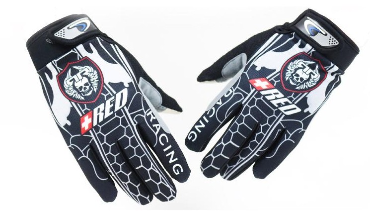 Questi guanti con stampa di teschio e scritta Racing sono adatti per lo sport.