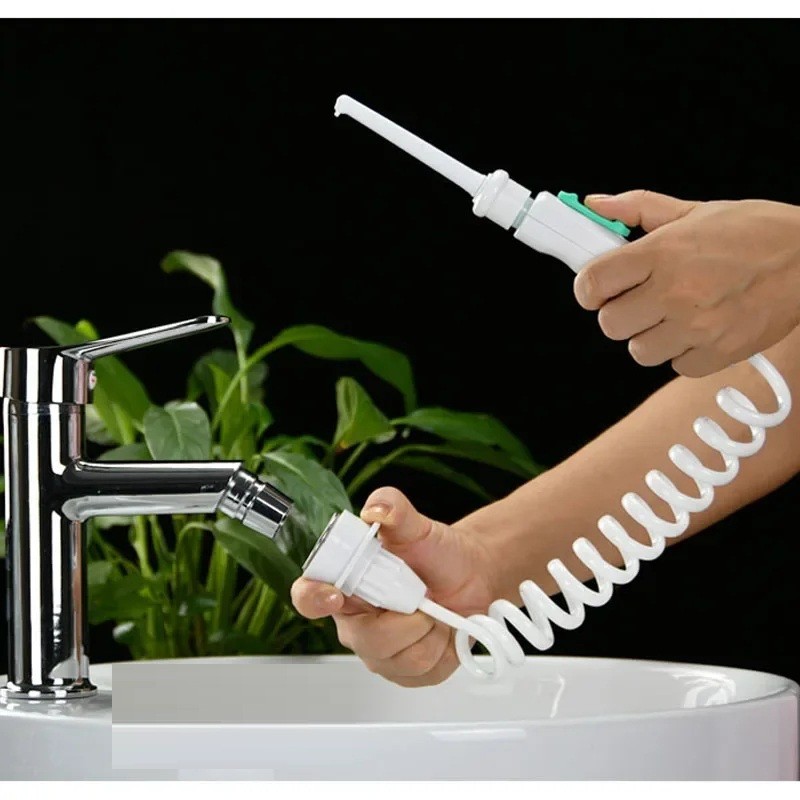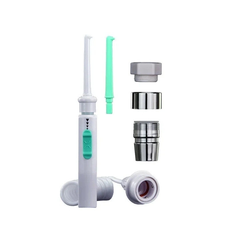 Irigatore pratico per la pulizia degli spazi interdentali, collegabile al rubinetto. Senza alimentazione, con pressione dell'acqua regolabile e set di punte e adattatori. Descrizione completa