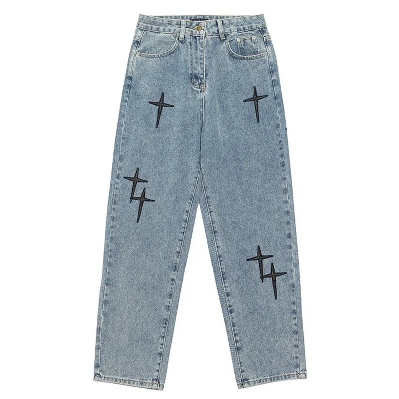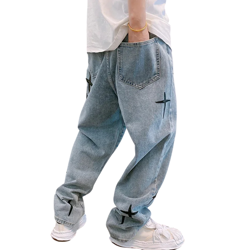 Jeans blu da uomo con ricamo nero di stelle Pantaloni larghi dritti Pantaloni lunghi larghi Jeans comodi e larghi Stile streetwear